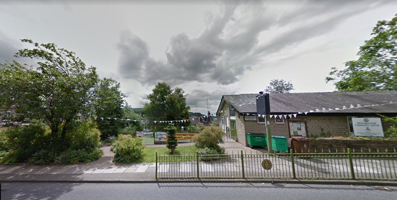 "}' title="On this ground stood the mighty 'Broadbottom Industrial Co Op' It was quite a place for a village. More like a shop you may find in a Town. There was a library on the upper floor(third) and I was kept in place by my aunt telling me the floor was unsafe. Possibly it was, because it didn't last too long before it was pulled down, and in it's place there was an Adventure playground built, then the present Community Centre was built some time later.